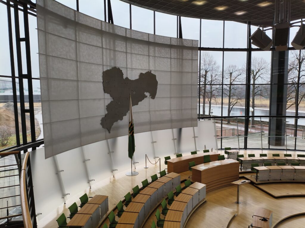 Nachdem uns diese Informationen mitgeteilt wurden, durften wir uns von der Zuschauertribüne den Plenarsaal anschauen. Dies ist der Raum, in dem die Abgeordneten diskutieren und über Gesetze abstimmen. Die Sitzplätze sind halbkreisförmig angeordnet, damit sich alle sehen können und Diskussionen besser möglich sind. Vorn befindet sich das Präsidium, das die Sitzung leitet und für Ordnung sorgt. Außerdem hingen im Plenarsaal eine große sächsische Flagge und eine metallene Karte von Sachsen mit vielen eingestanzten Löchern. Jedes Loch stellt dabei 30.000 Einwohner dar. In den Plenarsaal durften wir leider nicht, weil noch die Technik von einer Veranstaltung vom Vortag aufgebaut war.